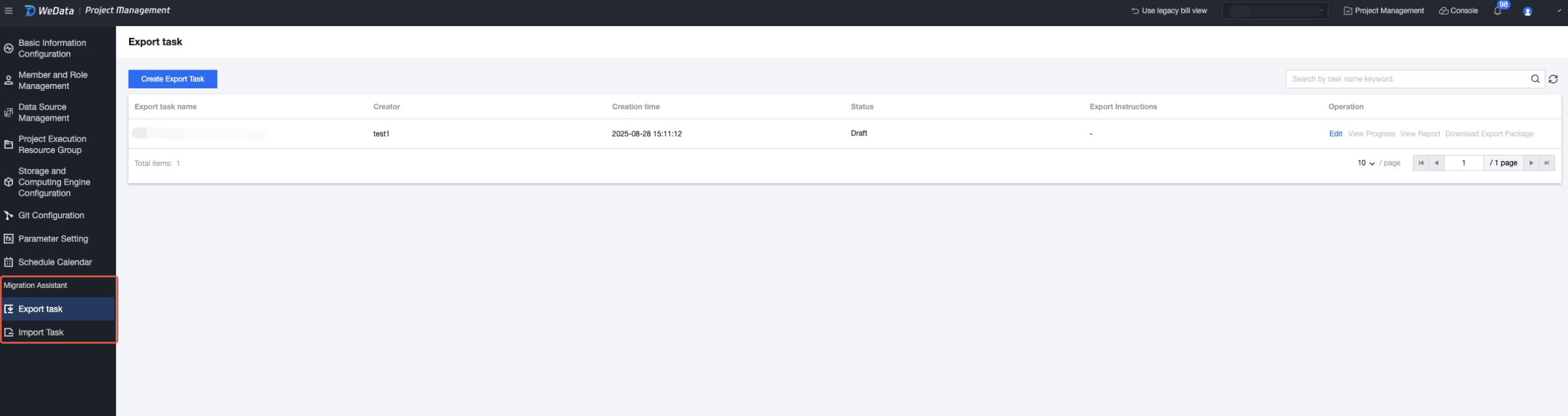 4. On the Projects page, select export task or import task from the left list. The migration assistant includes export and import features, corresponding to exporting tasks from a project as a compressed package and uploading the package to projects to generate tasks respectively.