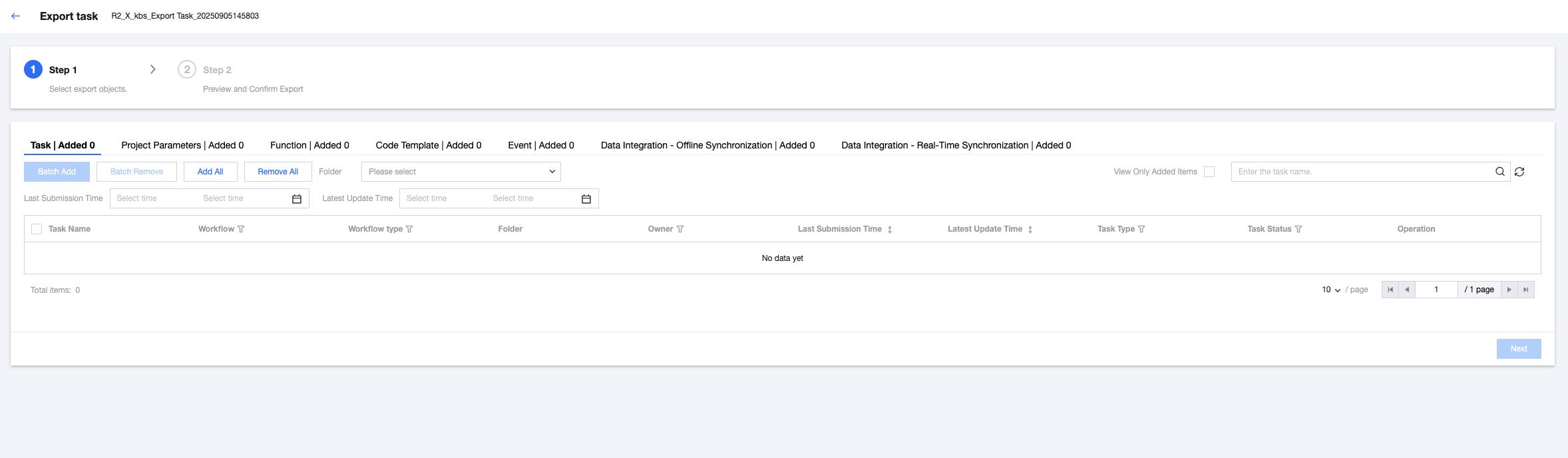 2. Select export objects. Export objects include tasks in the orchestration space, project parameters, functions, events, Data Integration - offline synchronization task, and Data Integration - real-time synchronization tasks. After completing the selection, click Next at the bottom of page.