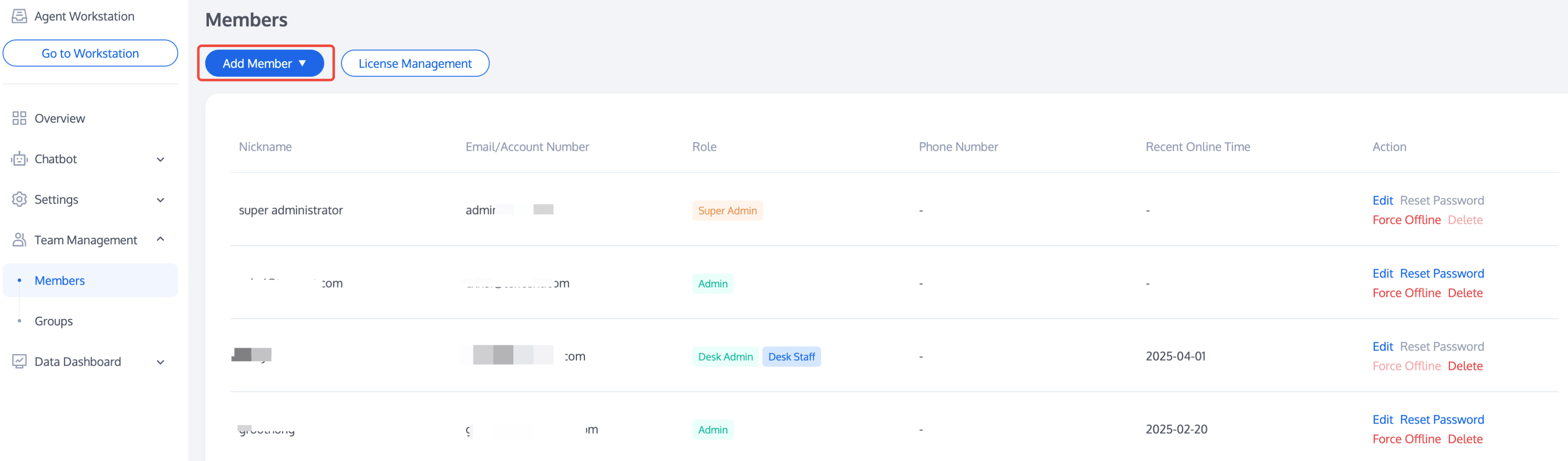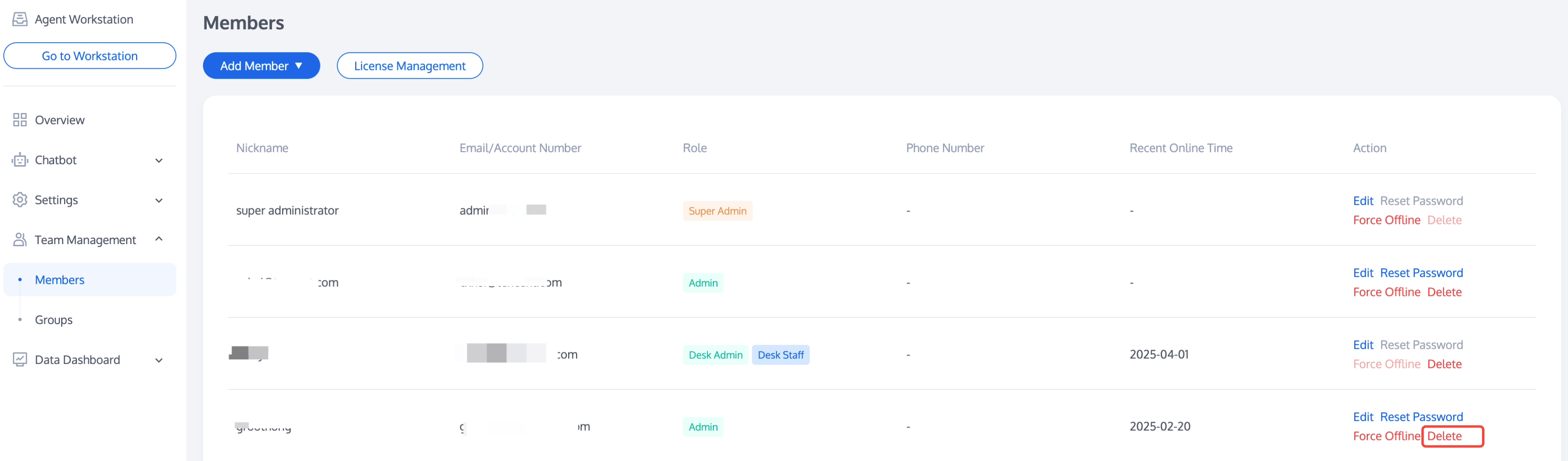 Access the management console, select Team management > Member, enter the member list page, and click Delete in the Action column of the target member. Once deleted, the member will not be able to log in. Force Offline