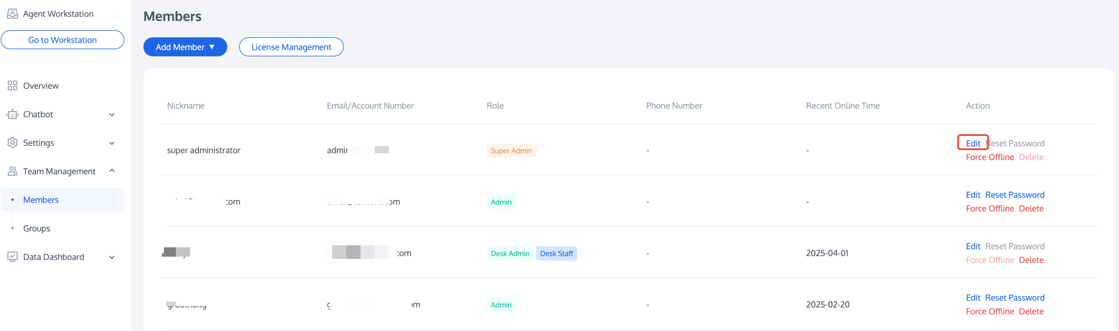 Desk Admin: Can only use the smart customer service management panel to edit, reset passwords, force log out, and delete online admins and employees. Cannot reset their own password or force themselves offline.