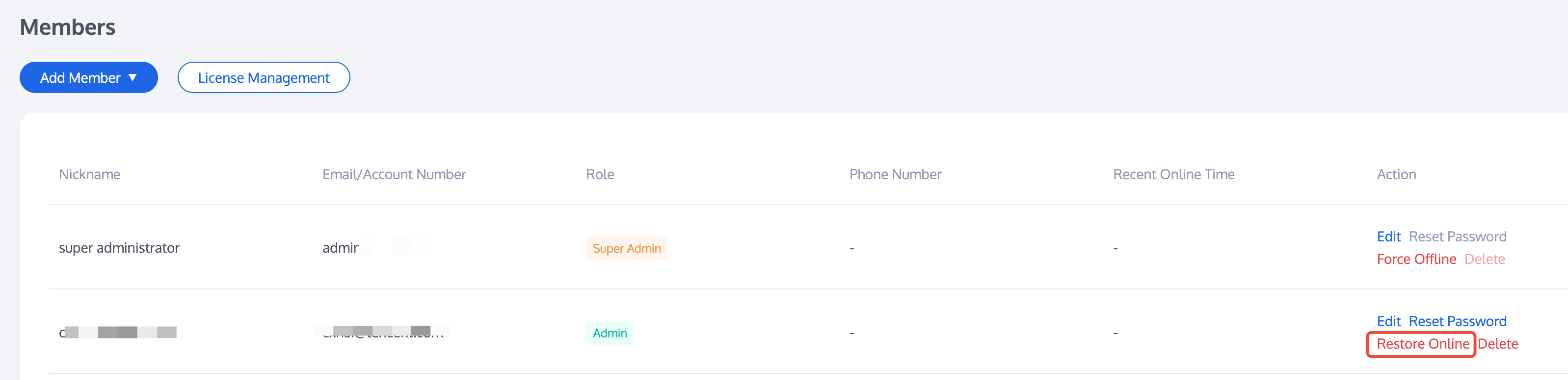 After setting a force offline for a member, if you need to lift the login restriction on the member, please visit management console, select Team management > Member, enter the member list page, and you can click Restore Online in the Action column of the target member. The member can continue to log in.