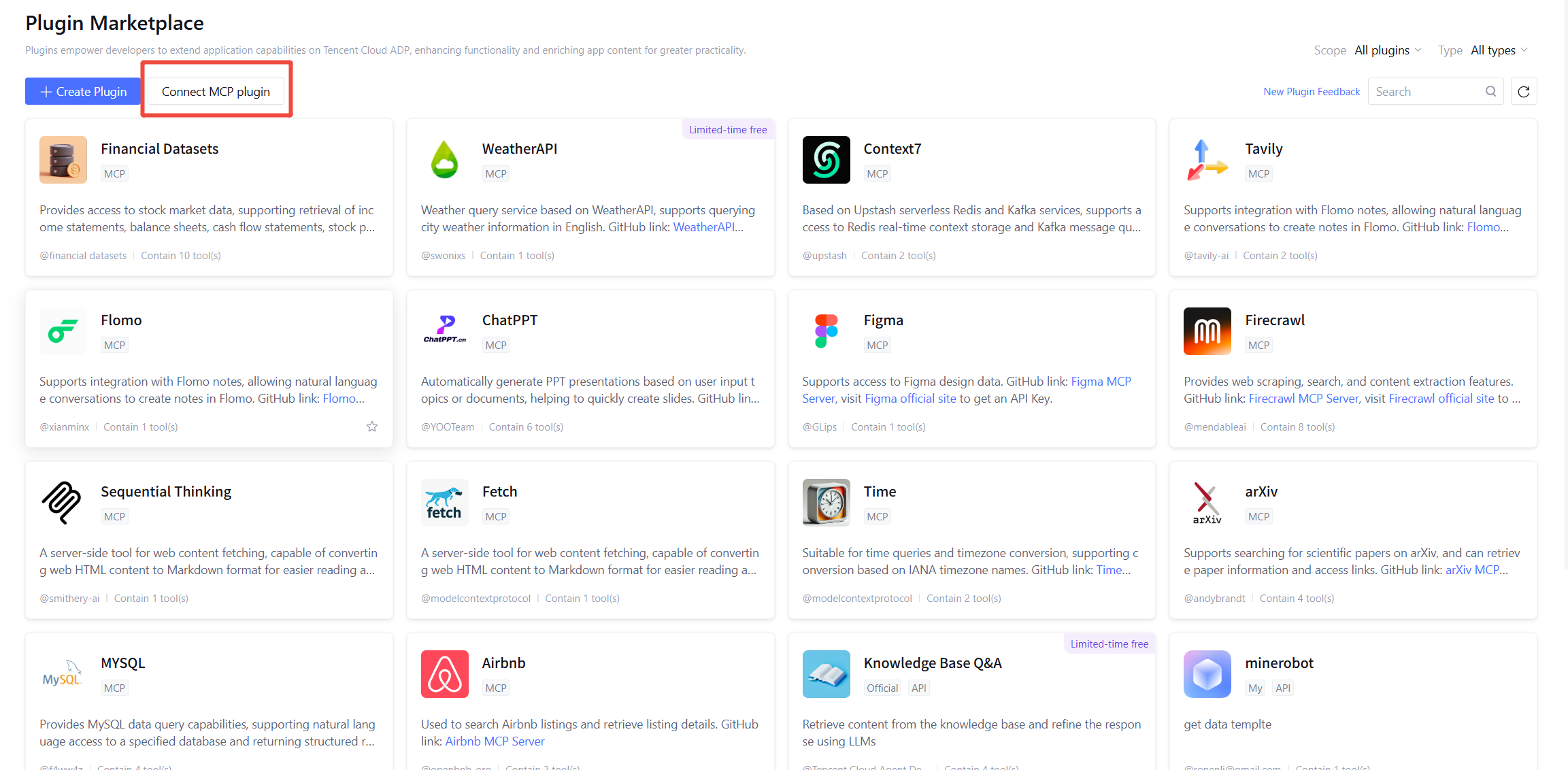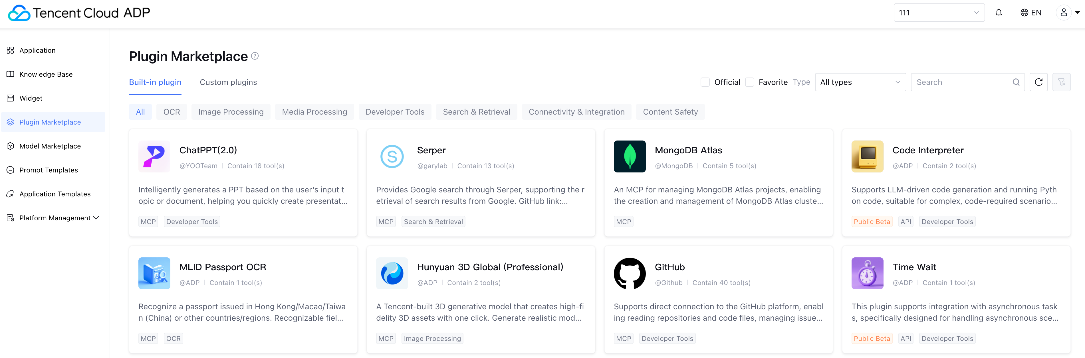 Tencent Cloud Agent Development Platform, as an enterprise-level large model application build platform, supports access to a massive number of tools in the MCP ecosystem, accelerating the large model application build process. Plugin Marketplace offers a large number of MCP plugin types, divided into the following plugin types based on different sources: