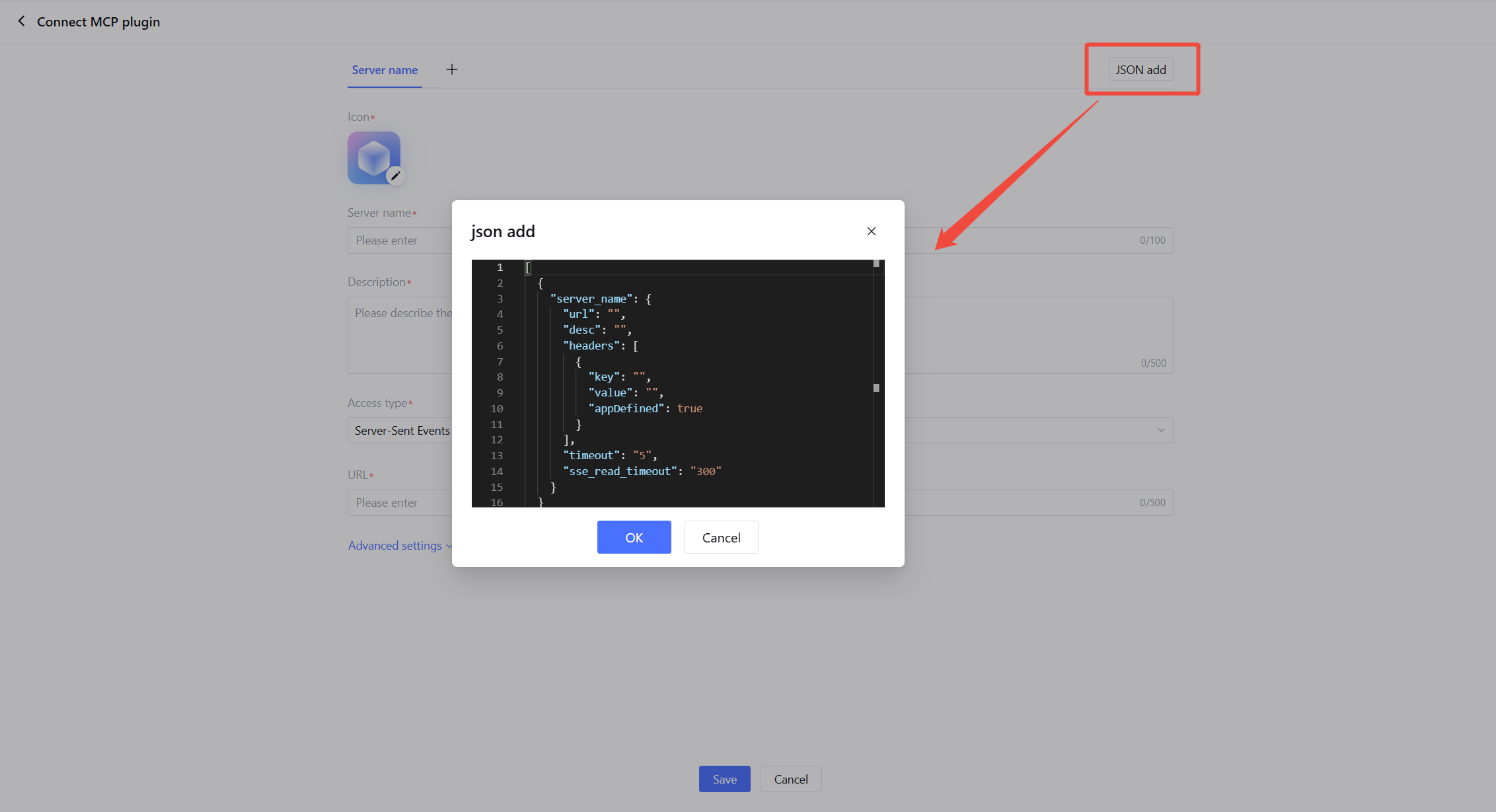 Except for specifying the server type, you can also customize the plugin Header, request timeout duration, and SSE service timeout duration in Advanced Settings.