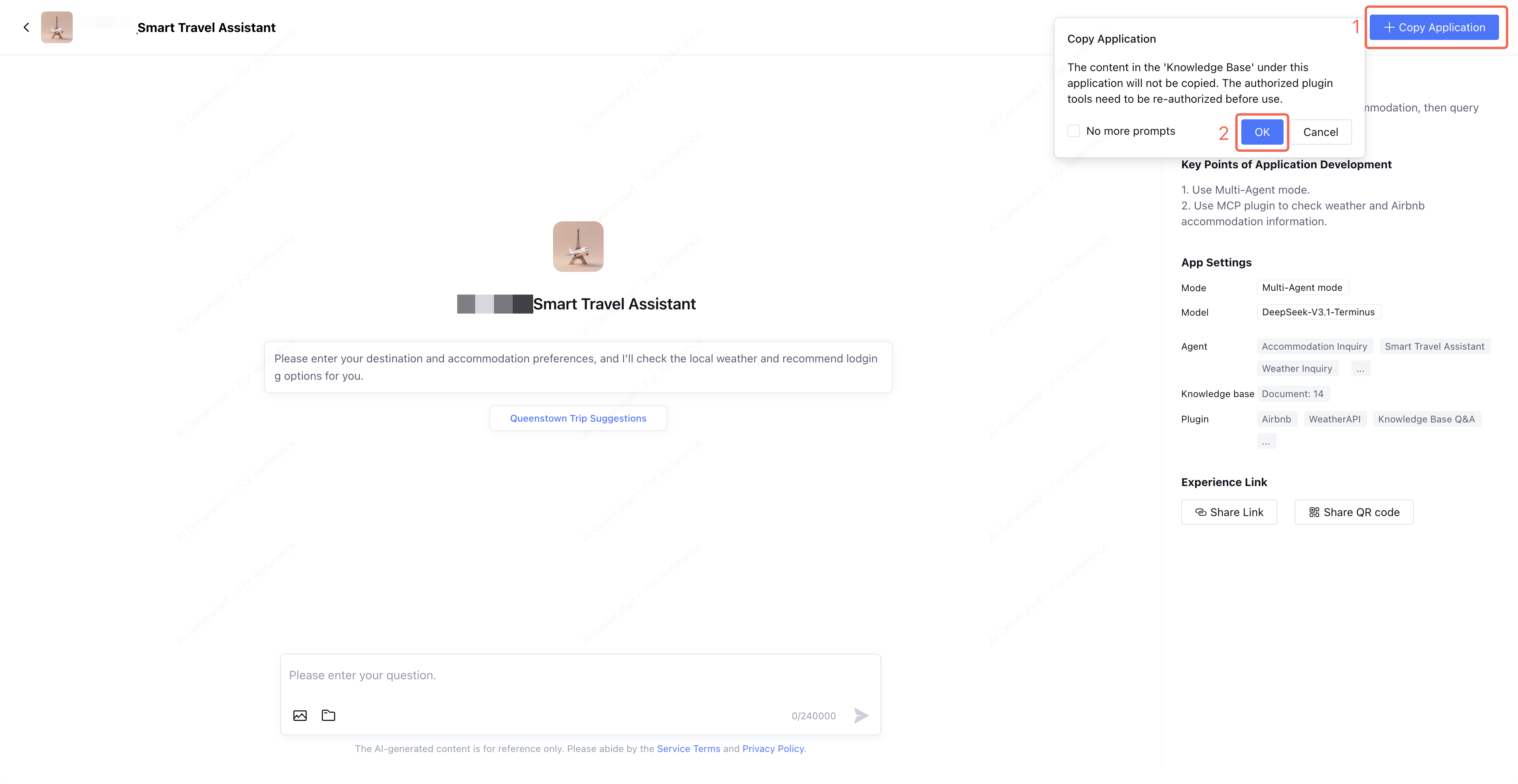 The content in the "knowledge base" under the application will not be copied. Authorized plug-in tools must be reauthorized before usage.