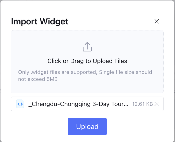 Select and upload the .widget file, click Confirm. After successful upload, enter the Widget editing page.