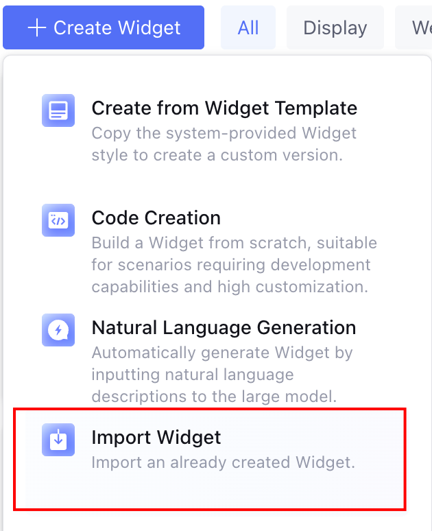 Support importing created Widget configuration files, compatible with .widget files exported by OpenAI Widget Builder. The imported Widget can be used directly or modified on this basis.