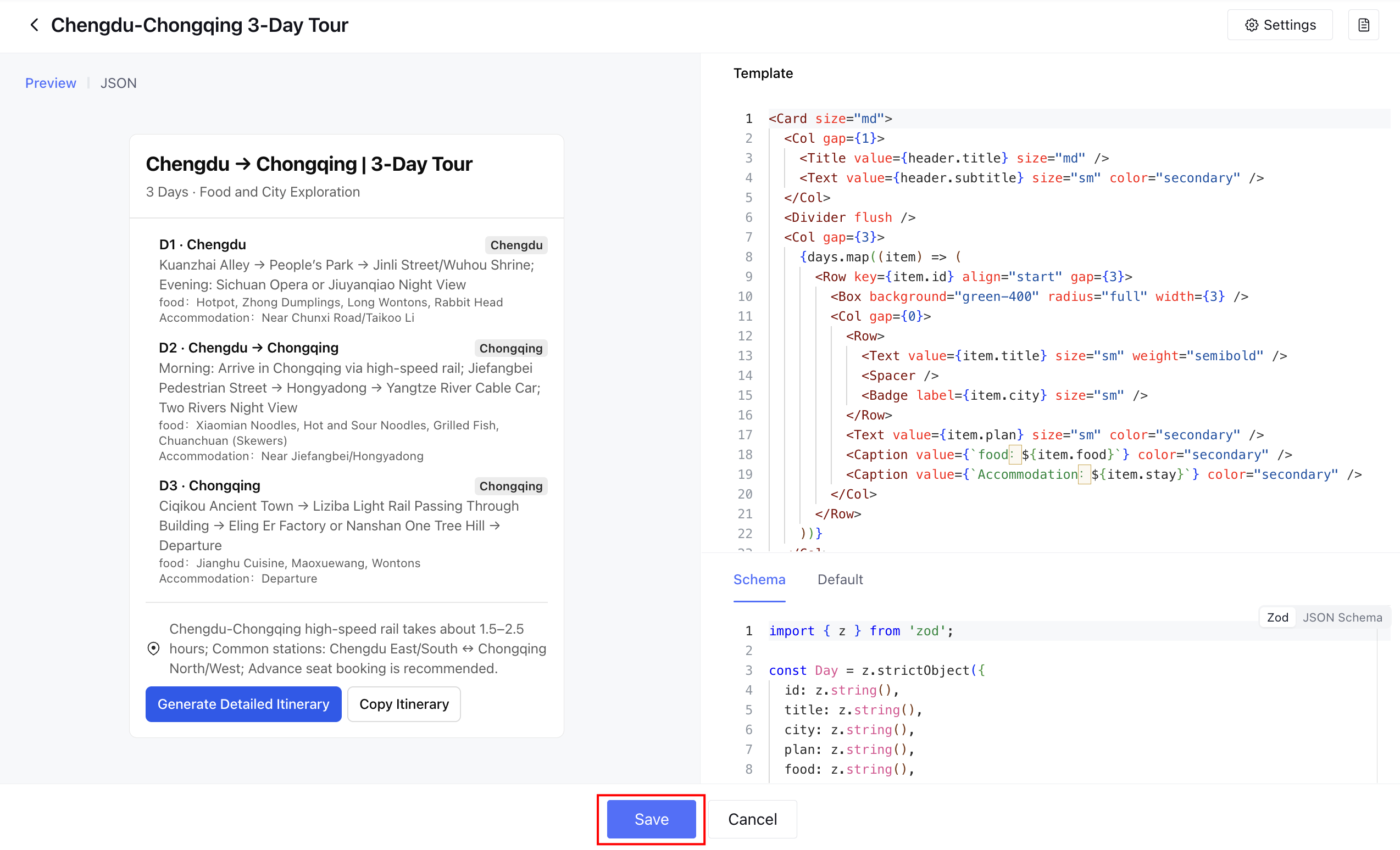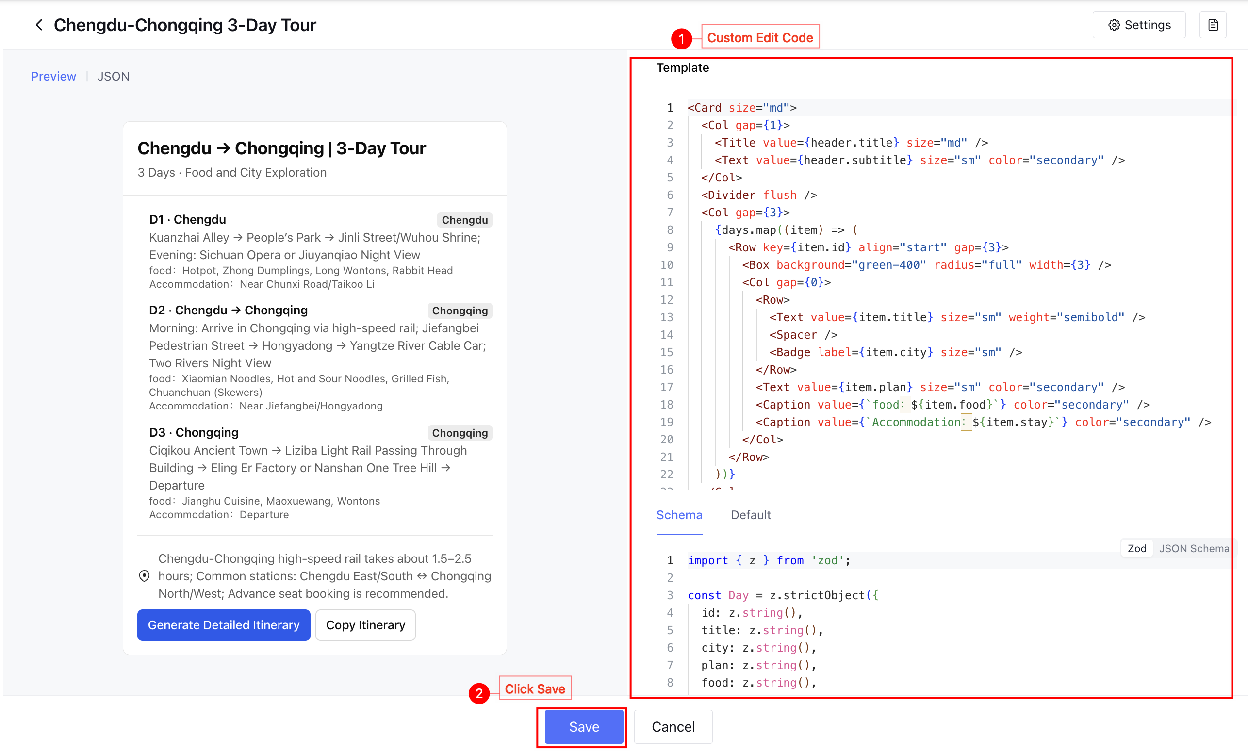Customize Template, Schema, and Default before saving the Widget file. For component usage and editing methods, see Widget Components.