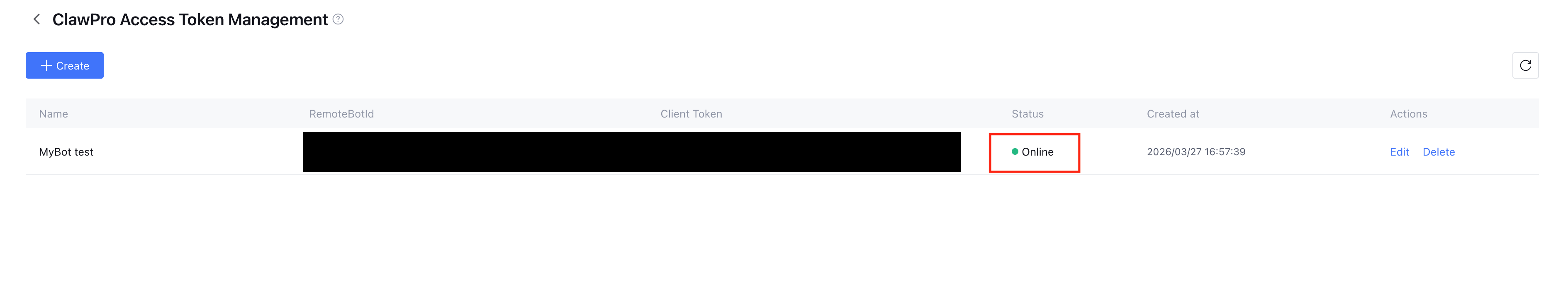 After the configuration is complete, check the OpenClaw status on the OpenClaw Token Management page of the Tencent Cloud ADP. If it shows "Online", it indicates that the configuration is successful.