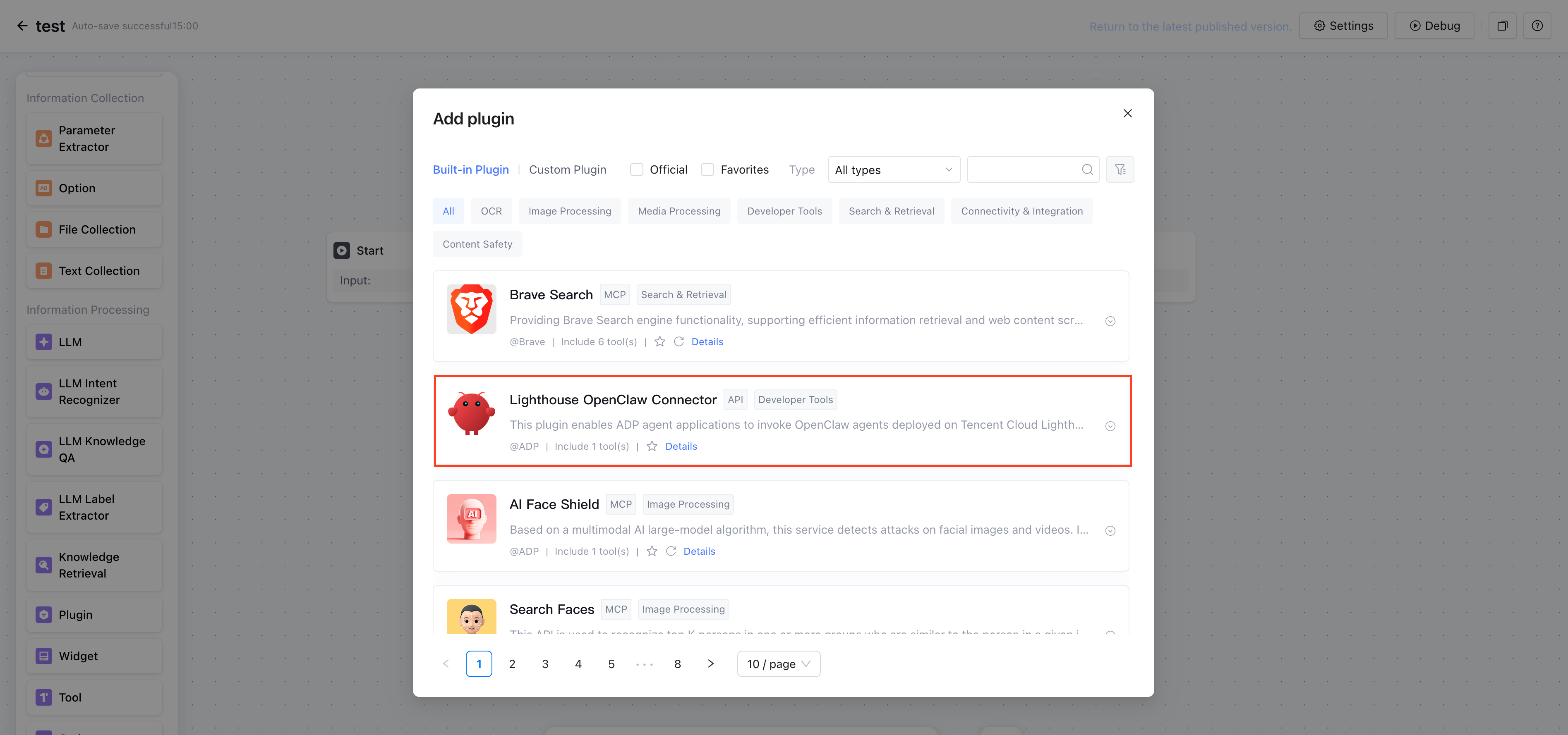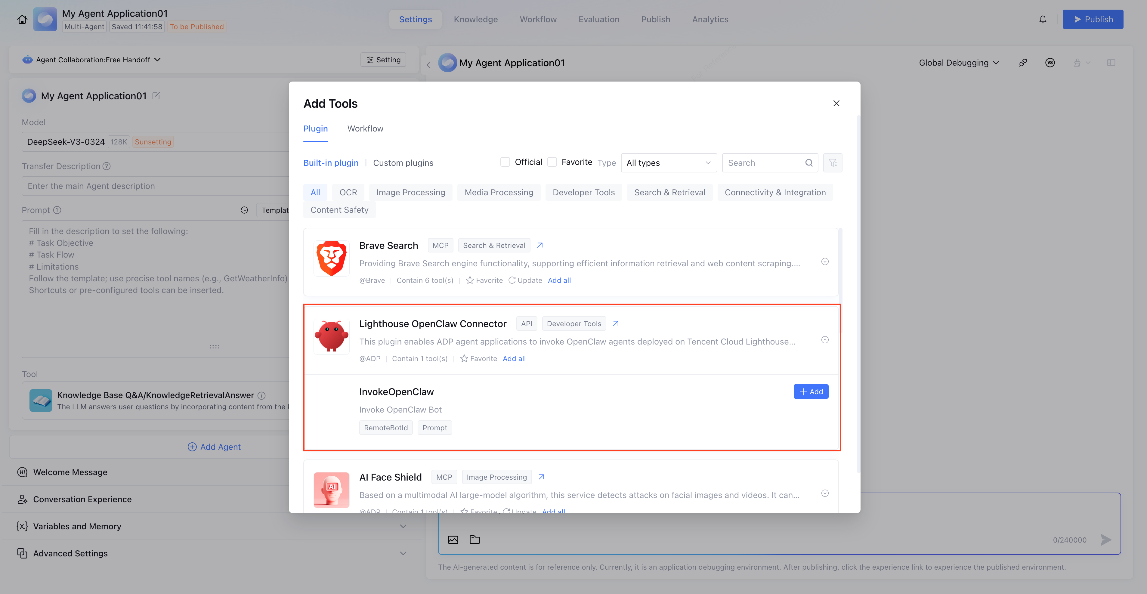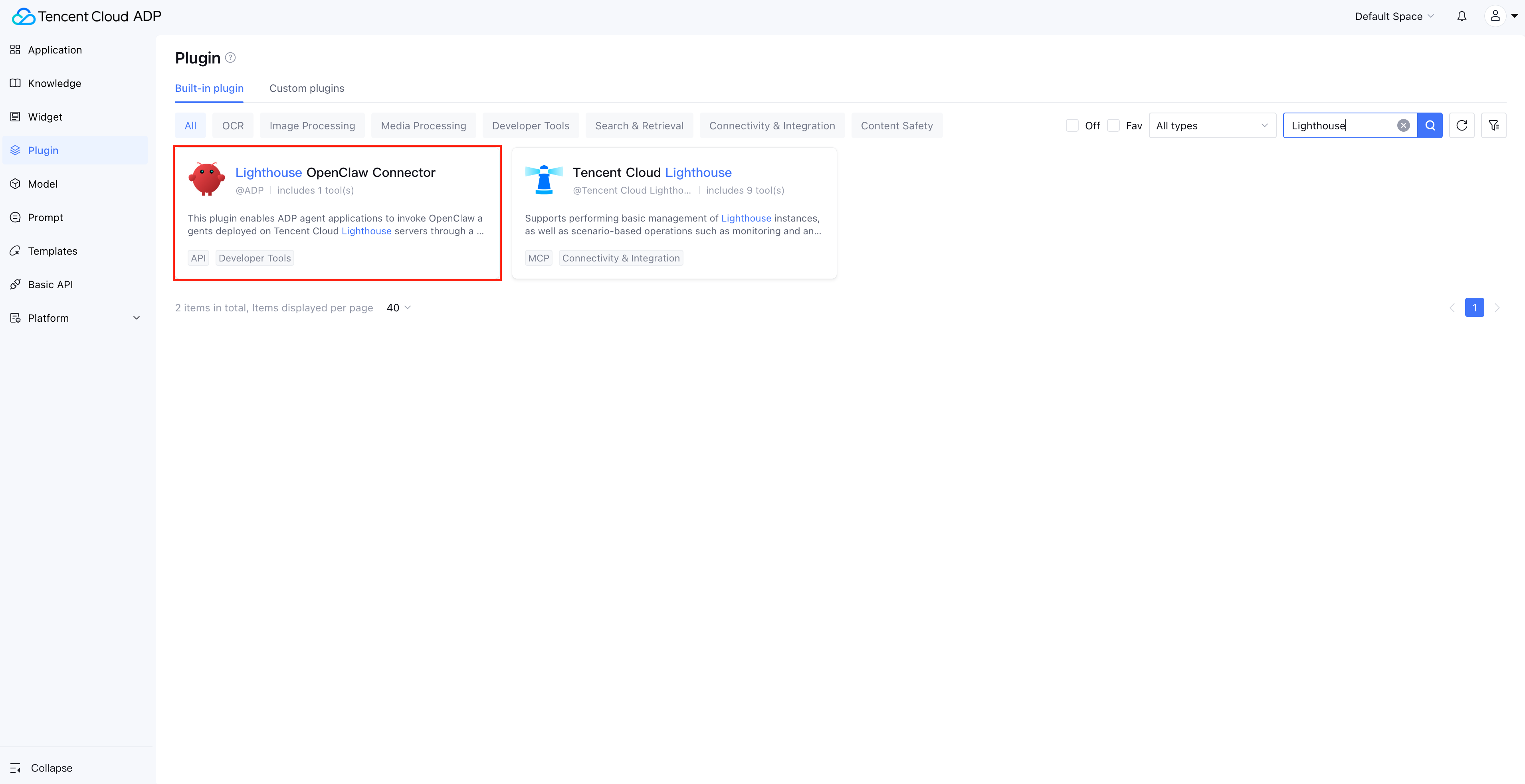 Step 2: Locate the Lighthouse OpenClaw Connector plugin in Tencent Cloud's Intelligent Agent development platform