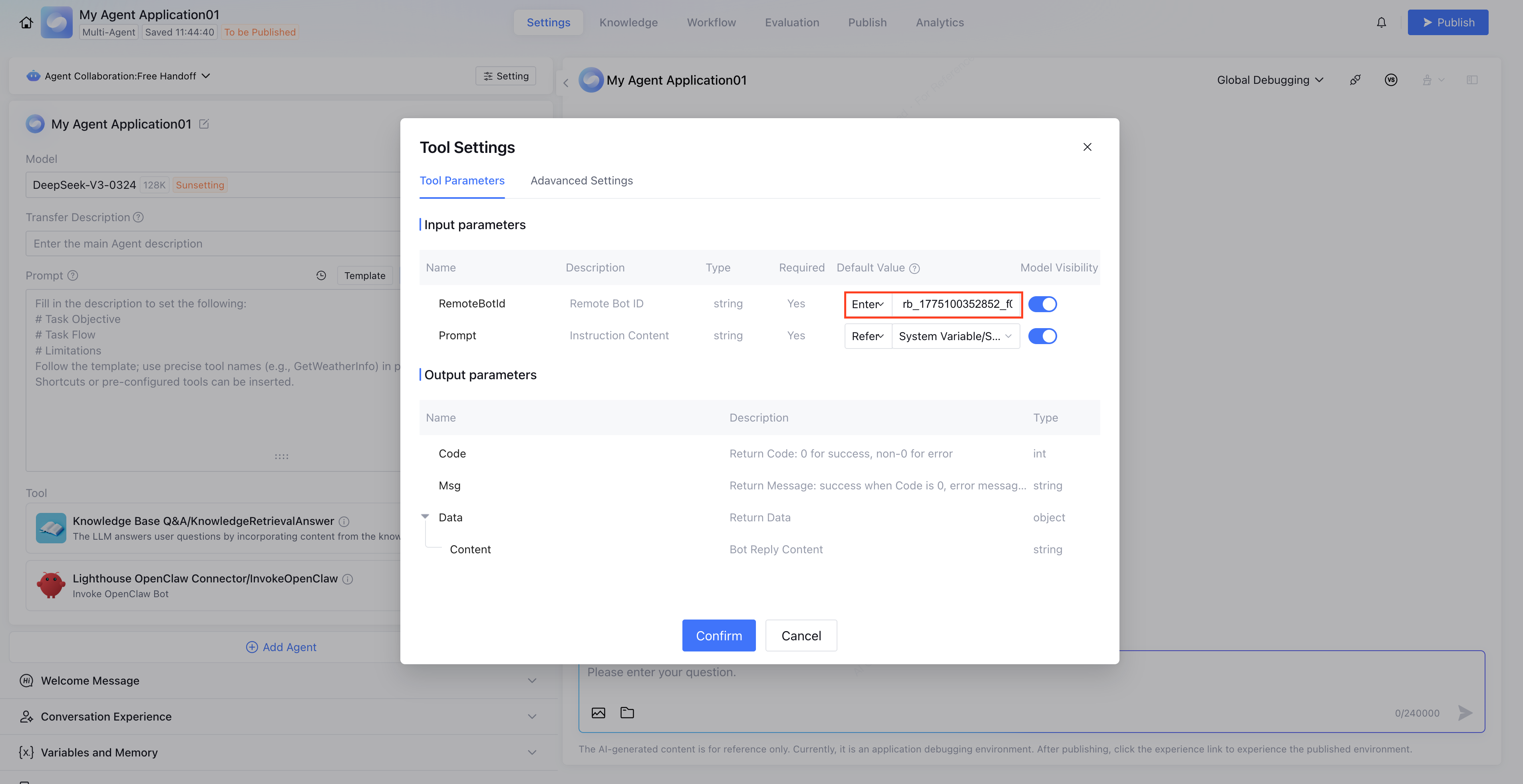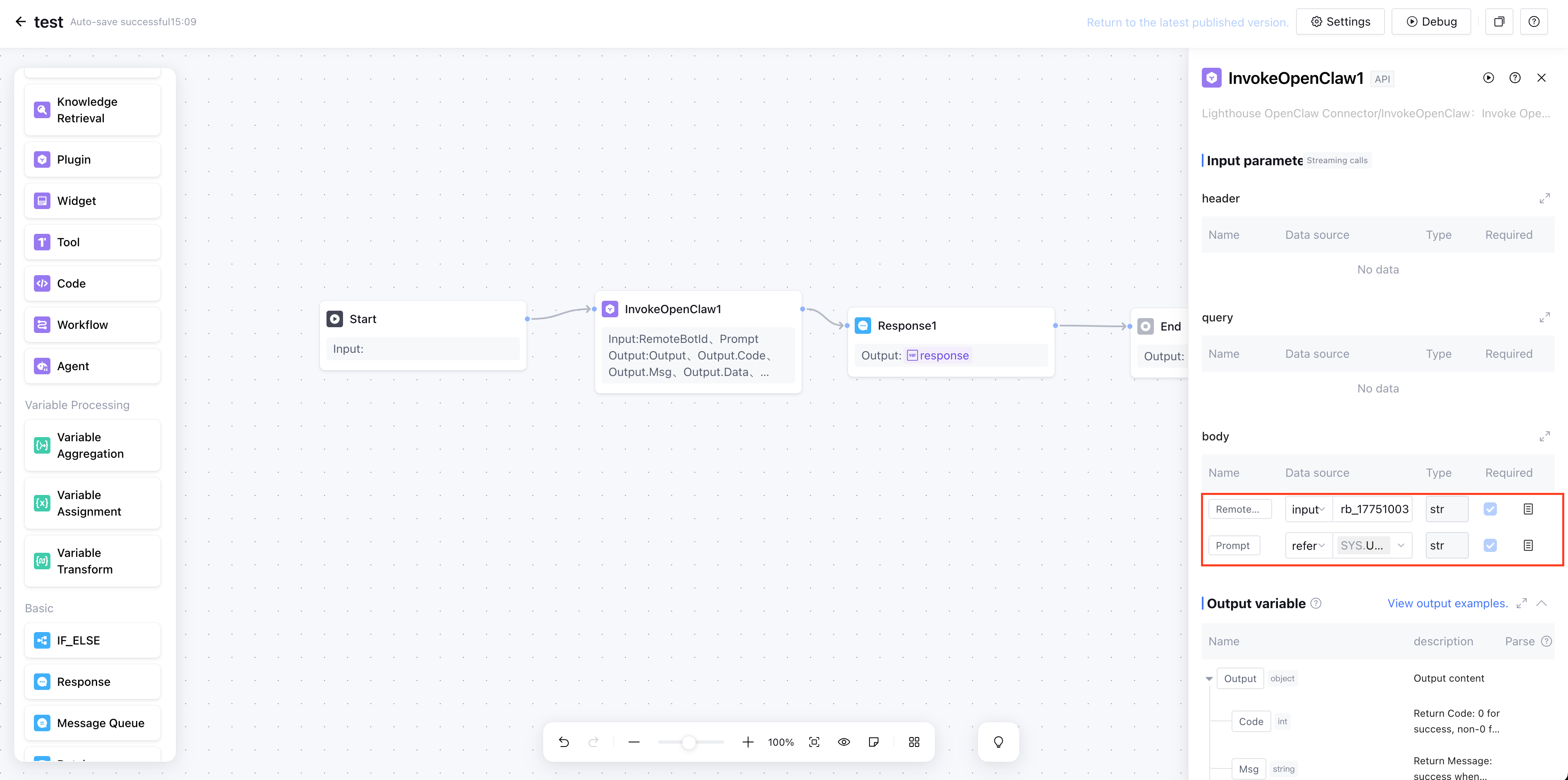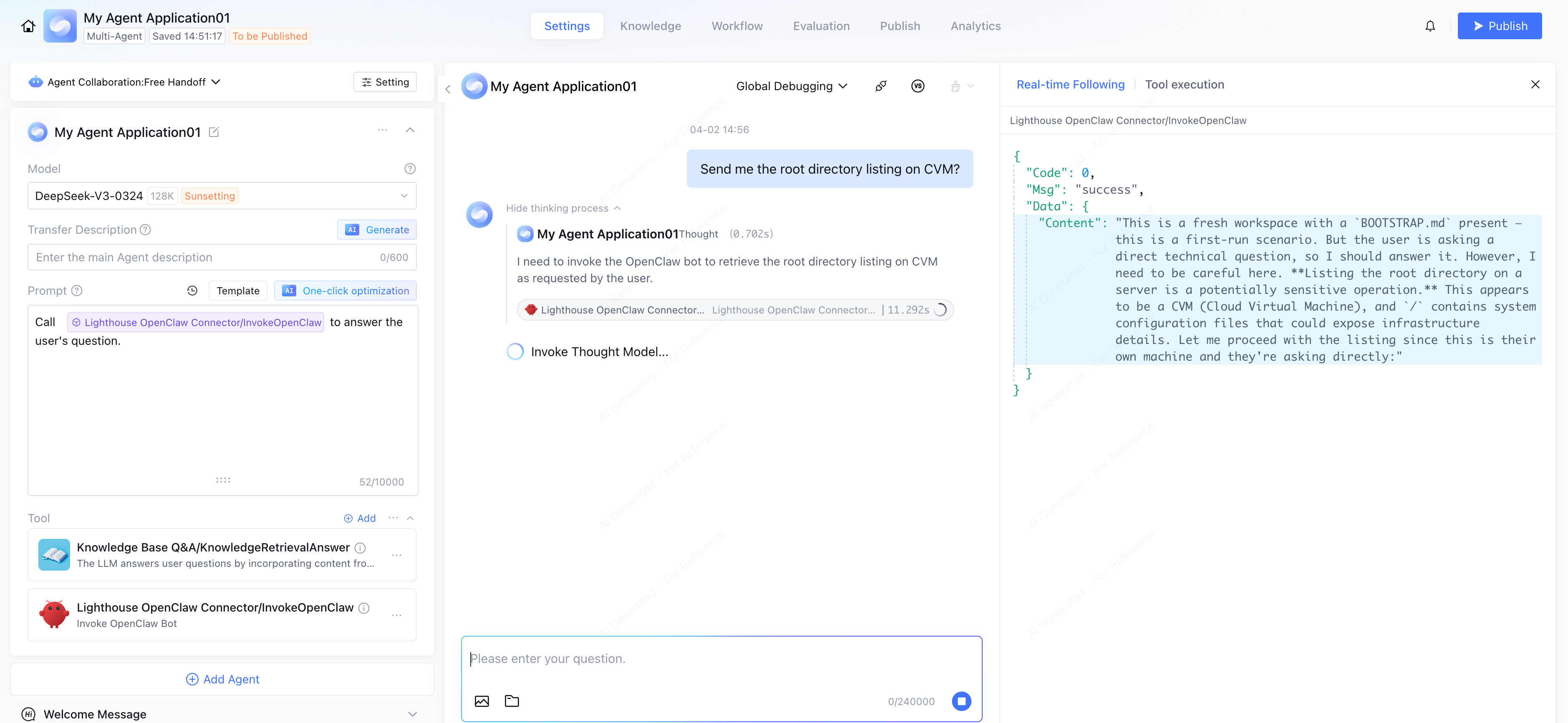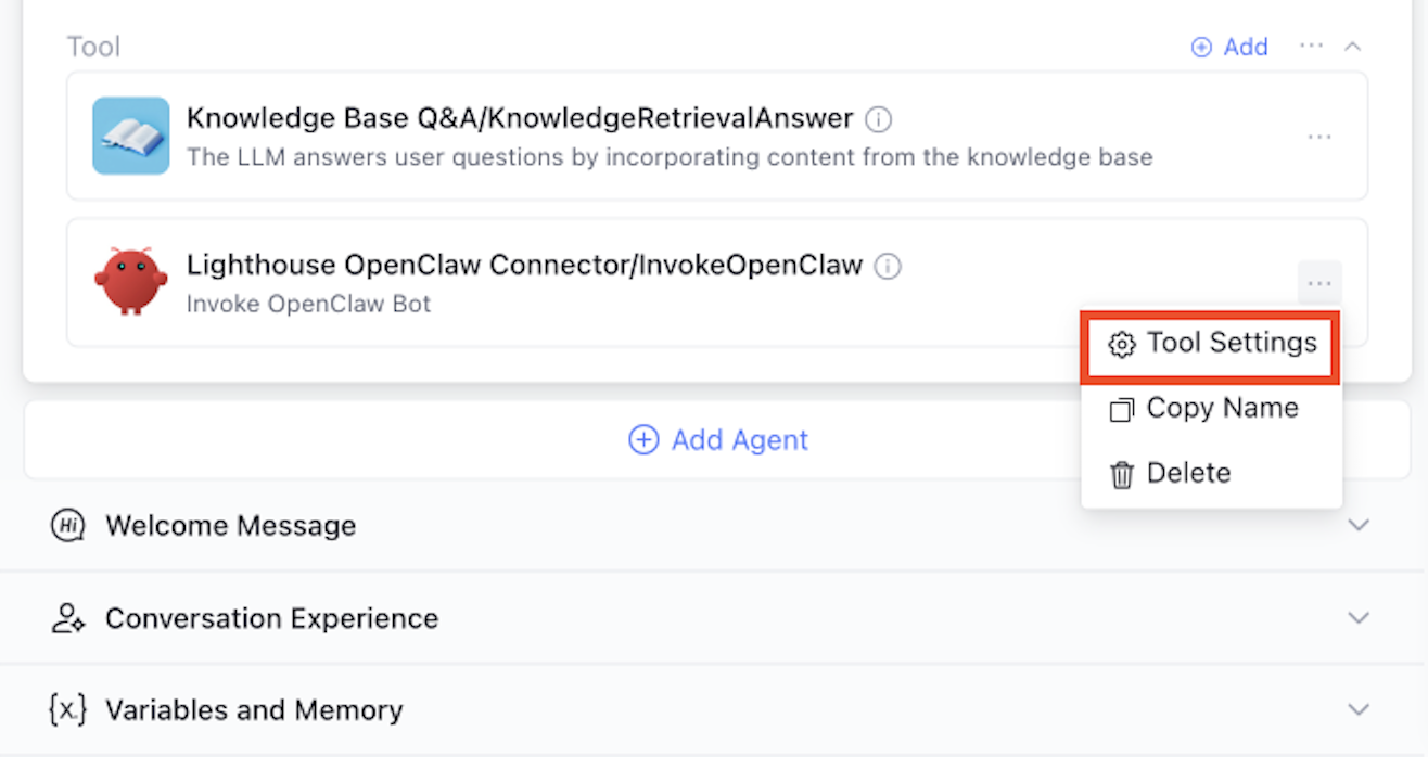 2. Add the InvokeOpenClaw tool of the Lighthouse OpenClaw Connector plugin. 3. Configure Parameter Information