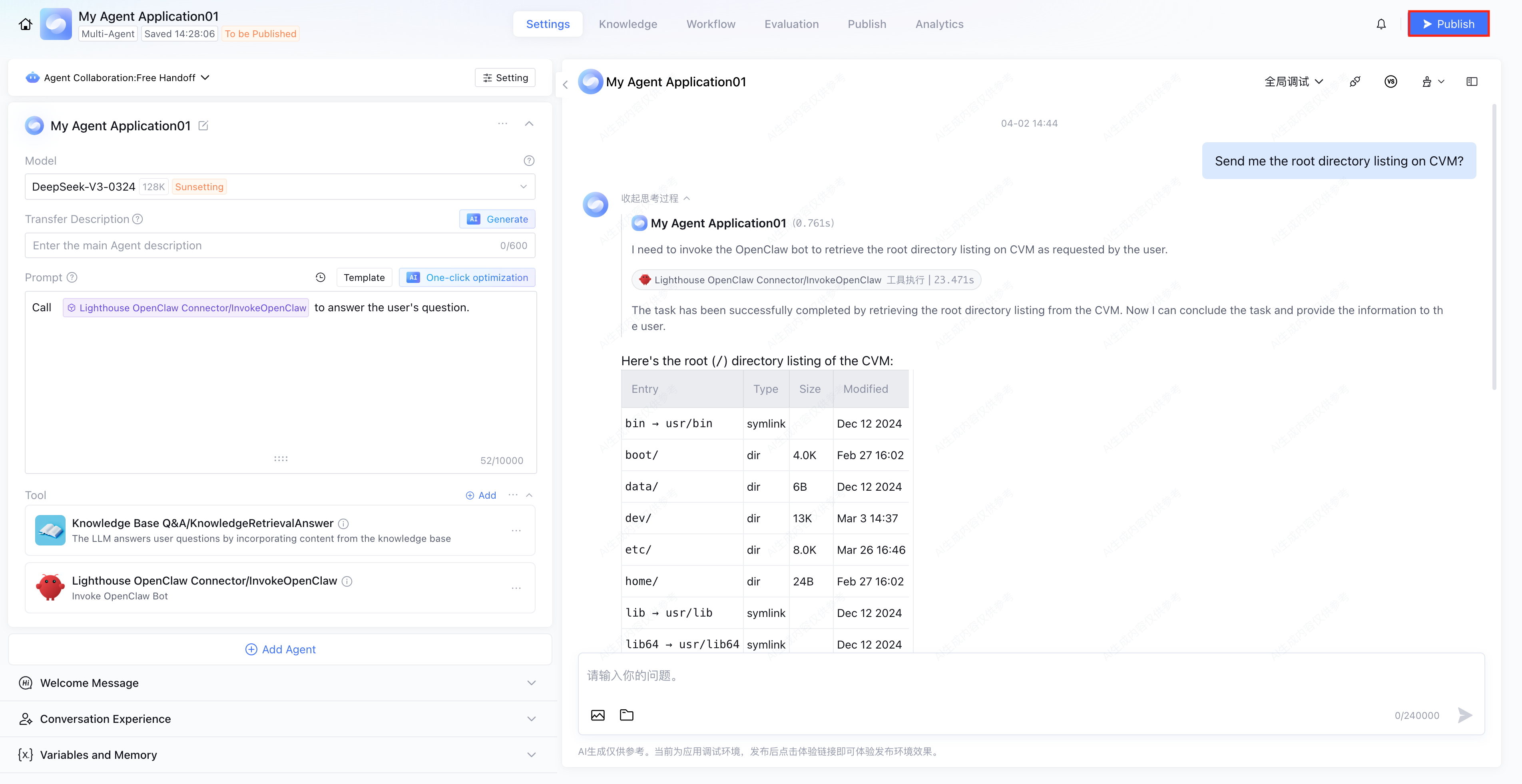 2. Observe the execution process; the Intelligent Agent will automatically invoke the InvokeOpenClaw plugin. After OpenClaw completes execution, the results will be automatically returned to the Intelligent Agent to generate the response.