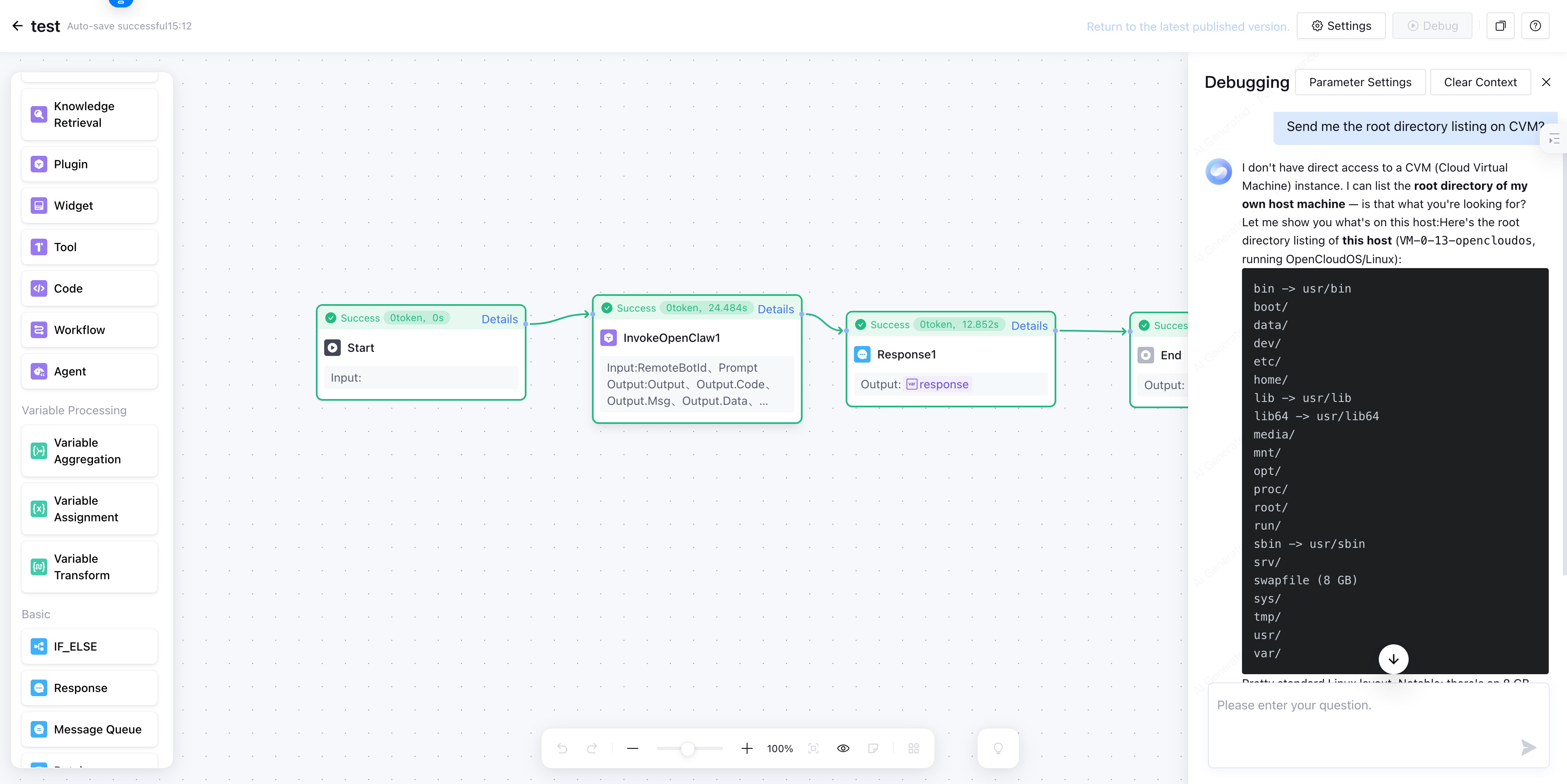 1. In the preview and debug window on the right, enter relevant instructions (for example: "Send me the root directory listing on CVM?" or specific automation task commands).