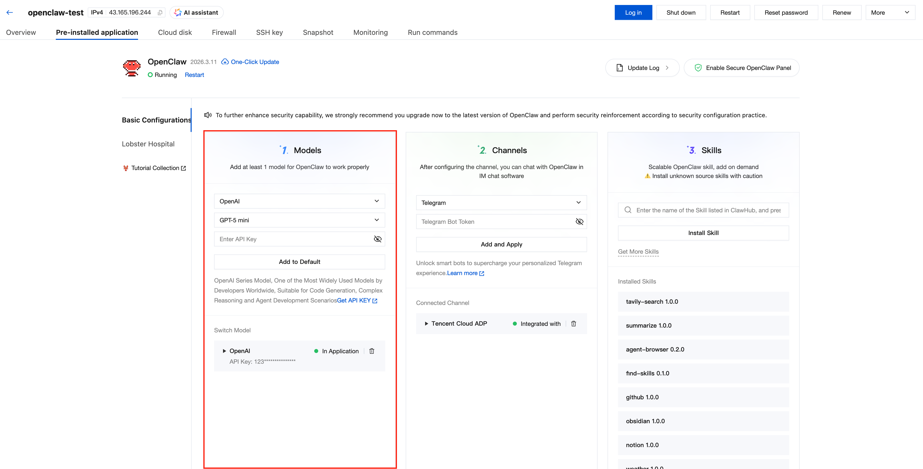 3. After the update is complete, go to the Application Management tab. In the "Channel Configuration" input box, select "Tencent Cloud ADP", enter the ClientToken and SignKey of the RemoteBot obtained in the previous steps, and click Add and Apply. After several tens of seconds have passed, the page will prompt "Save Successful", indicating that the configuration is complete.
