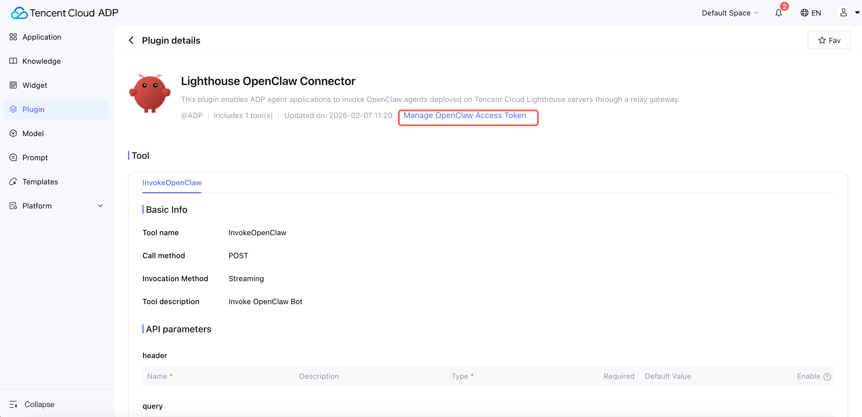 In real-world business scenarios, enterprises often need to deploy OpenClaw on their own servers (such as Tencent Cloud Lighthouse) to perform tasks like browser automation and complex operations. With the Lighthouse OpenClaw Connector plugin provided by Tencent Cloud ADP, you can securely and stably connect Intelligent Agents built on ADP with OpenClaw robots deployed on Lighthouse, enabling remote capability invocation without complex network configurations.