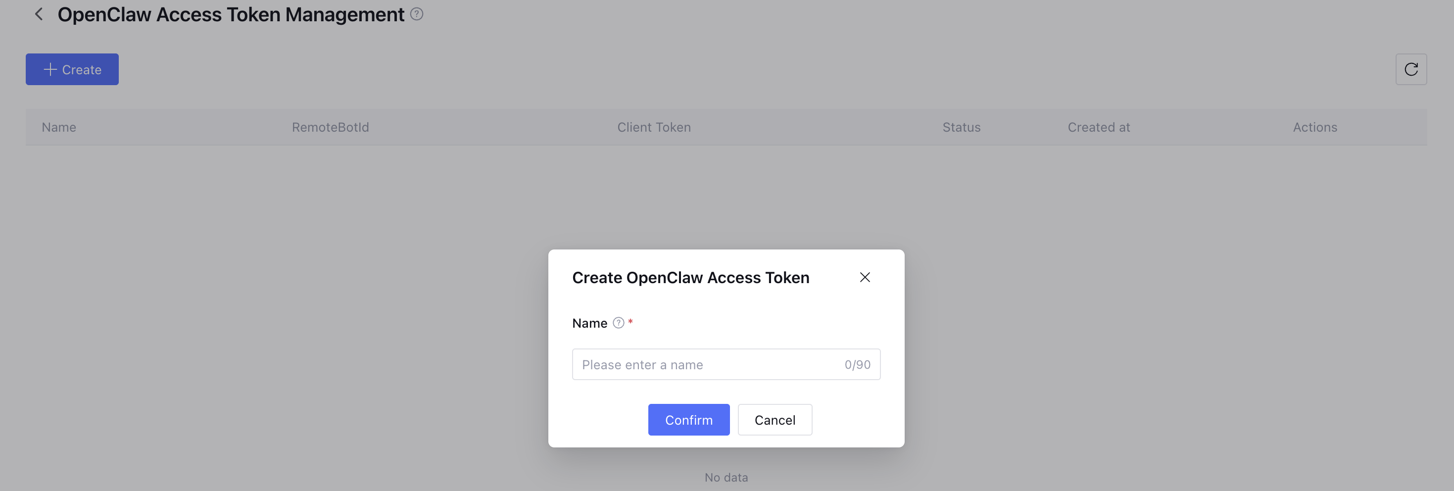 3. After reading and agreeing to the User Agreement, enter the OpenClaw access Token name and click Confirm.
