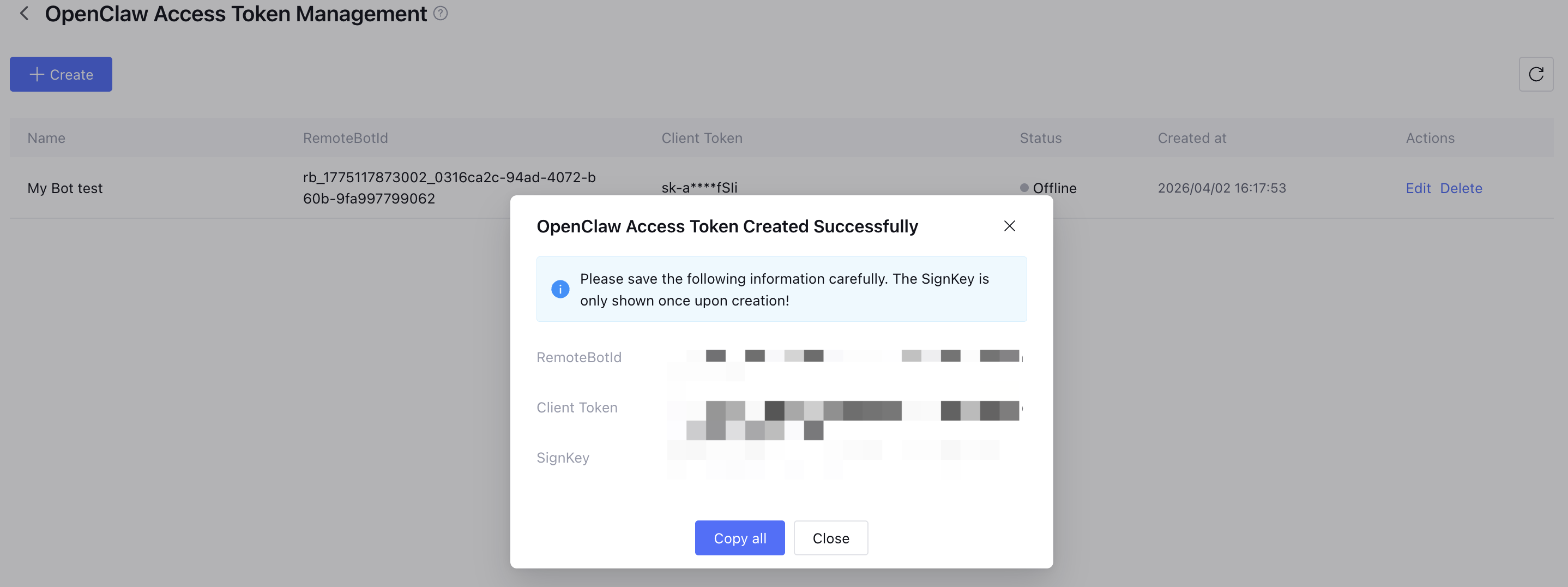 4. After creation is complete, the system will generate RemoteBotId, Client Token, and SignKey.