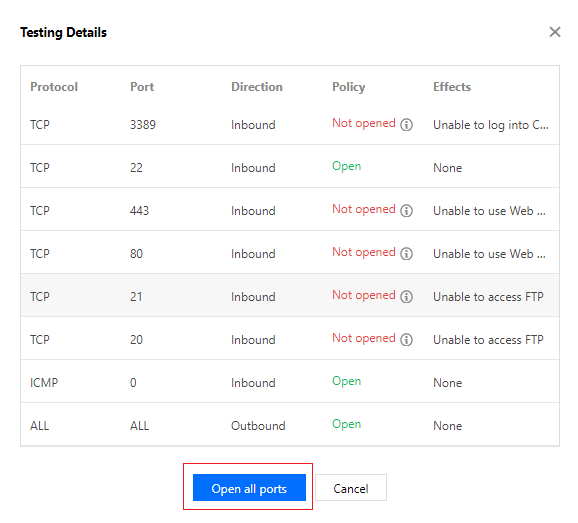 Jika masalah disebabkan oleh masalah port grup keamanan, Anda dapat menggunakan fungsi Open all ports (Buka semua port) untuk membuka semua port.