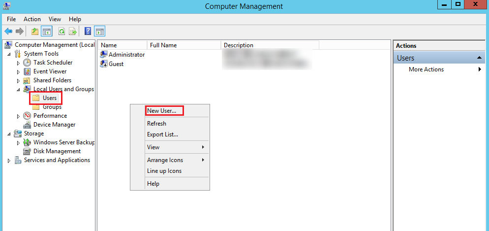 3. Di sisi kanan antarmuka Users (Pengguna), klik kanan tempat kosong, dan pilih New User (Pengguna Baru), seperti yang ditunjukkan pada gambar di bawah ini: