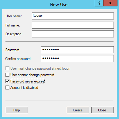 Hapus User must change password in next login (Pengguna harus mengubah kata sandi saat login berikutnya), dan pilih Password never expired (Kata sandi tidak pernah kedaluwarsa).