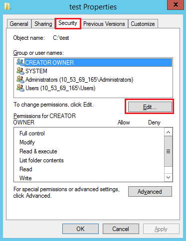 1. Di jendela Properties (Properti), pilih tab Security (Keamanan). Klik Edit (Edit), seperti yang ditunjukkan pada gambar di bawah ini: