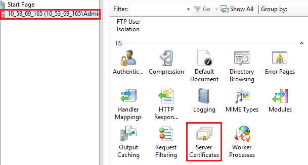2. Jendela Internet Information Services (IIS) Manager (Pengelola Layanan Informasi Internet (IIS)) akan muncul. Pilih server di bilah sisi kiri dan klik dua kali Server Certificates (Sertifikat Server) di antarmuka kanan, seperti yang ditunjukkan pada gambar di bawah ini: