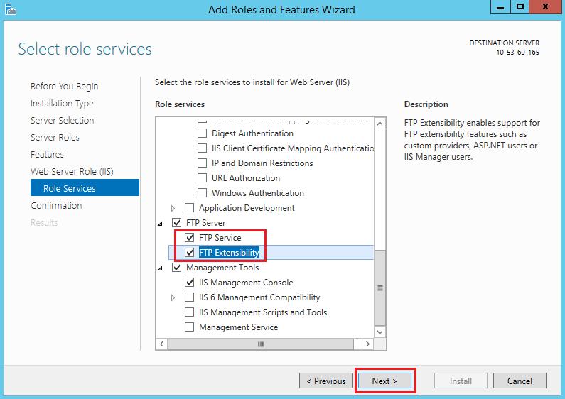 8. Pilih FTP Service (Layanan FTP) dan FTP Extension (Ekstensi FTP), lalu klik Next (Selanjutnya), seperti yang ditunjukkan pada gambar di bawah ini: