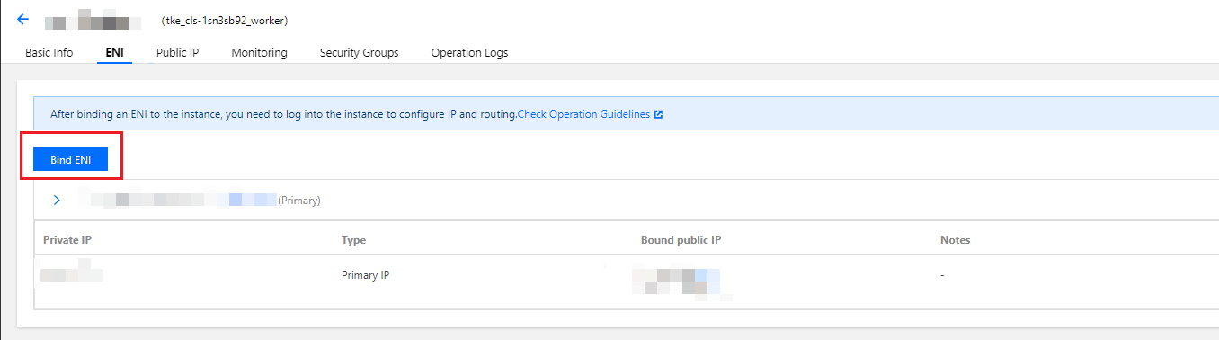 3. Pilih tab ENI (ENI), lalu klik Bind ENI (Ikat ENI) untuk membuat ENI yang berada di subnet yang sama dengan ENI primer.