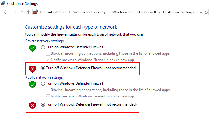 4. Pilih Turn off Windows Firewall (Nonaktifkan Windows Firewall) baik di panel Private network settings (Pengaturan jaringan pribadi) dan panel Public network settings (Pengaturan jaringan publik).