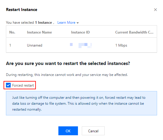 3. Di jendela Shutdown (Matikan) atau Restart Instance (Mulai Ulang Instans) yang muncul, centang Forced Shutdown (Matikan Paksa) atau Forced Restart (Mulai Ulang Paksa), dan Klik Ok (Oke).