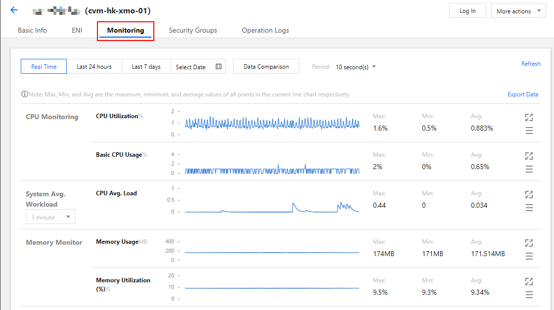 3. Pilih tab Monitoring (Pemantauan) untuk melihat penggunaan sumber daya instans, seperti yang ditunjukkan di bawah ini: