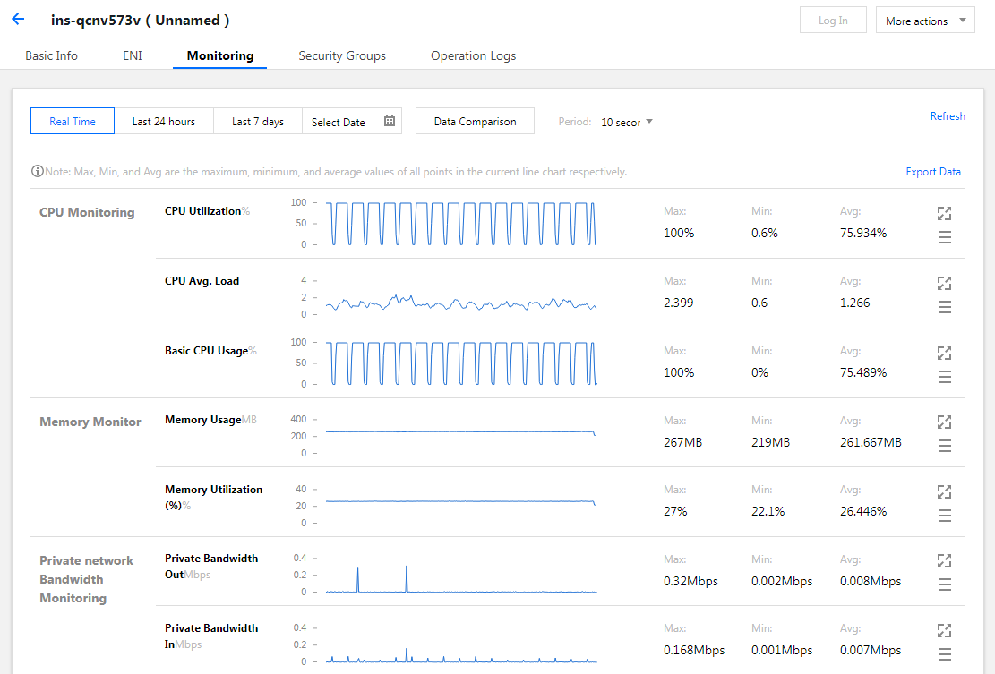 3. Klik ID instans untuk membuka halaman Monitoring (Pemantauan). Pada halaman ini, Anda dapat melihat metrik CPU, memori, bandwidth jaringan pribadi, bandwidth jaringan publik, dan penggunaan disk dari CVM, seperti yang ditunjukkan pada gambar berikut.