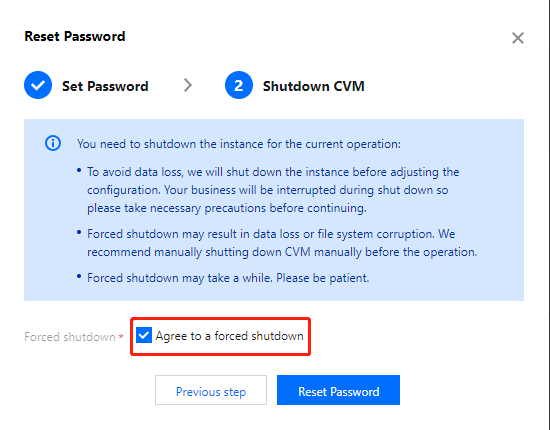 Untuk mengatur ulang kata sandi instans yang Running (Berjalan), pilih Agree to force shutdown (Setujui pematian paksa), lalu klik Reset Password (Atur Ulang Kata Sandi), seperti yang ditunjukkan pada gambar berikut: