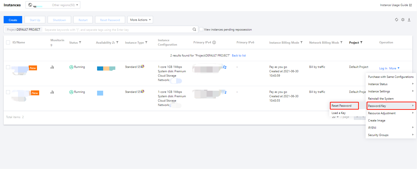 2. Pada halaman Instances (Instans), cari instans CVM target, lalu klik More (Lainnya) > Password/Key (Kata Sandi/Kunci) > Reset Password (Atur Ulang Kata Sandi) di kolom Operation (Operasi), seperti yang ditunjukkan pada gambar berikut: