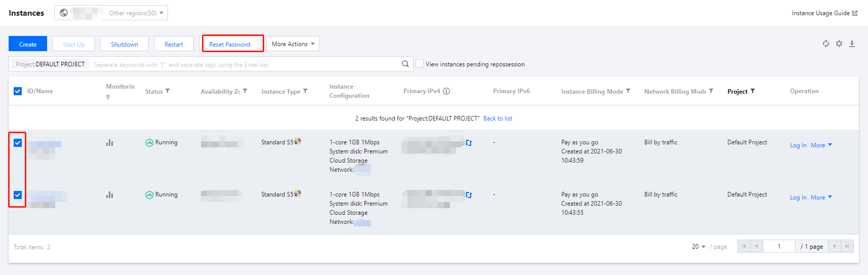 2. Pada halaman Instances (Instans), pilih instans CVM untuk mengatur ulang kata sandi, lalu klik Reset Password (Atur Ulang Kata Sandi) di bagian atas daftar instans, seperti yang ditunjukkan pada gambar berikut: