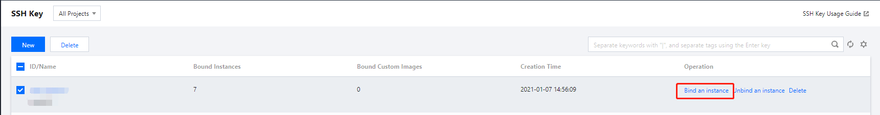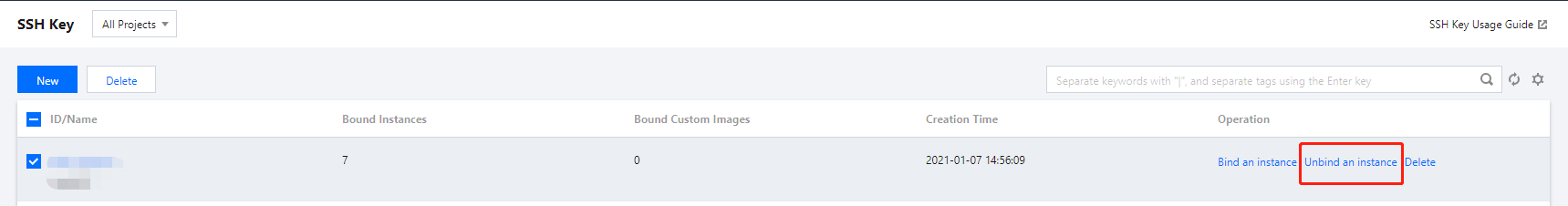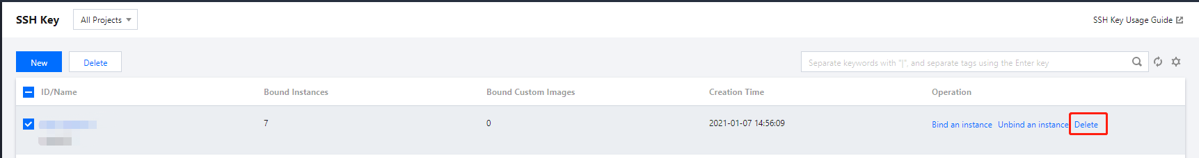 Kunci SSH tidak dapat dihapus ketika terikat dengan instans CVM atau citra kustom, tidak dapat dihapus.