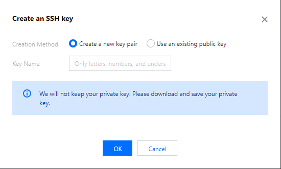 Setelah mengklik OK (OKE), kunci pribadi akan diunduh secara otomatis. Tencent Cloud tidak akan menyimpan kunci pribadi Anda. Pastikan untuk menyimpannya dengan aman.