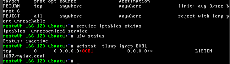 2. Setelah mengonfirmasi bahwa masalah disebabkan oleh kebijakan iptables, jalankan iptables –nvL untuk memeriksa apakah kebijakan membuka port 8081. Dalam contoh ini, port 8081 ditutup.