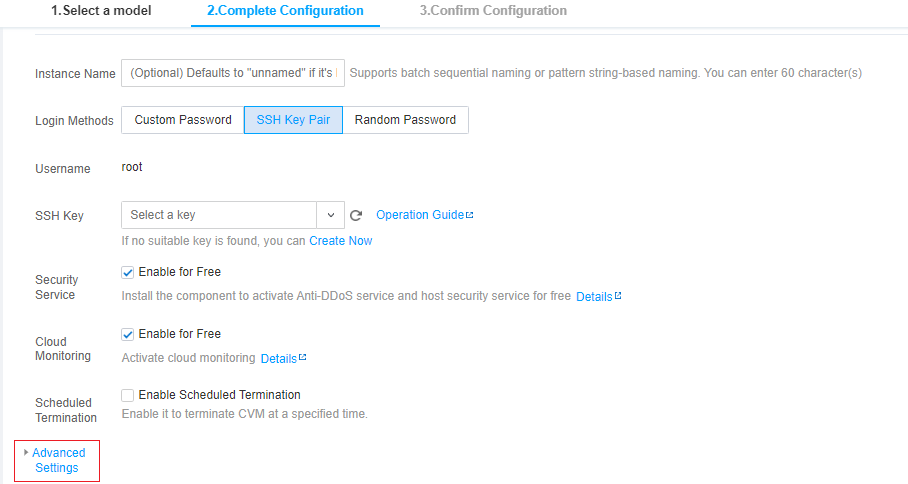 1. Gunakan Membuat Instans sebagai referensi dan buat instans CVM. Klik Advanced Configuration (Konfigurasi Lanjutan) di 4. Configure Security Group and CVM (Konfigurasi Grup Keamanan dan CVM), seperti terlihat pada gambar berikut: