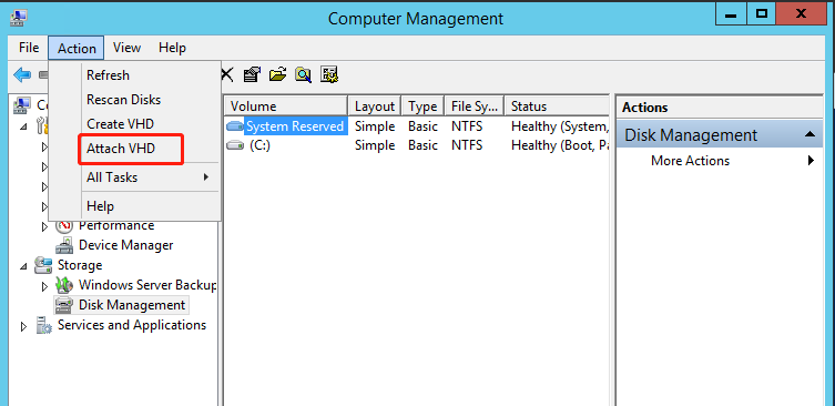 3. Pilih Action (Tindakan) > Attach VHD (Lampirkan VHD) di bagian atas jendela.