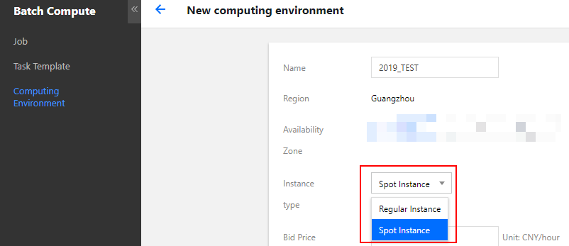 BatchCompute console (Konsol BatchCompute): Instans spot dapat dipilih saat pengguna mengirimkan pekerjaan dan membuat lingkungan komputasi di konsol BatchCompute.