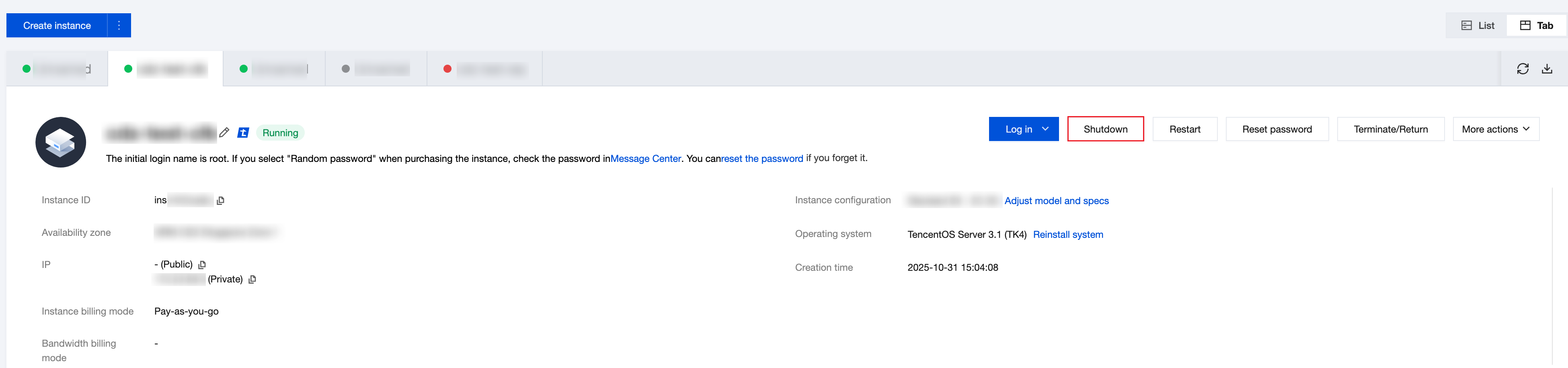 Tampilan Tab: Di halaman instance yang perlu dimatikan, pilih Shutdown di sudut kanan atas. Seperti yang ditunjukkan pada gambar berikut: