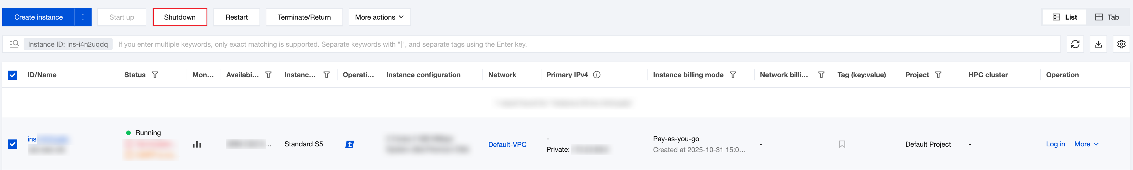 Shutdown satu instance: Anda dapat memilih Daftar atau Tab di sudut kanan atas untuk memilih mode tampilan, lalu beroperasi sesuai mode tampilan yang digunakan.