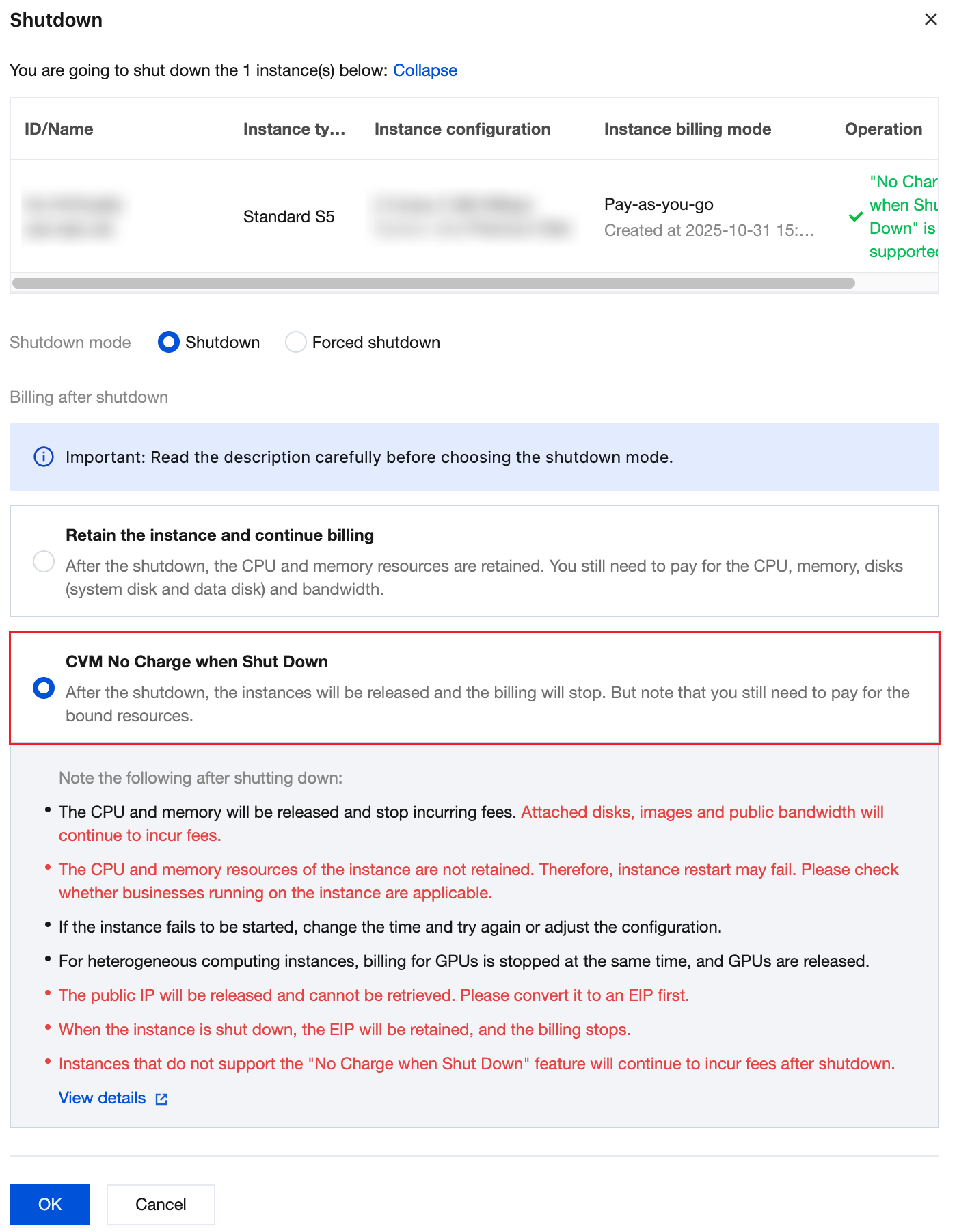 Instance tidak dikenakan biaya saat dimatikan mengacu pada instance dengan penagihan bayar sesuai pemakaian, saat dimatikan dengan memilih opsi matikan tanpa biaya, instance akan masuk ke status sudah dimatikan dan tidak lagi dikenai biaya untuk instance (CPU, memori). Komponen seperti Cloud Disk (disk sistem dan disk data) serta image akan terus dikenakan biaya. Seperti jika bisnis Anda tidak memerlukan instance berjalan terus-menerus, tetapi ingin mempertahankan data dan informasi konfigurasi instance untuk mendukung pemulihan penggunaan yang cepat di kemudian hari. Anda dapat menggunakan fitur Matikan Tanpa Biaya yang disediakan CVM untuk melepaskan sumber daya komputasi instance (CPU, memori), guna menghemat biaya tertentu.