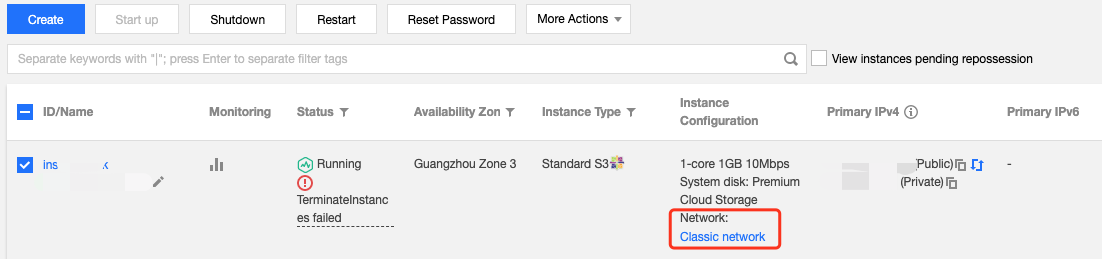 Instans ada di jaringan klasik jika “Jaringan: Jaringan Klasik” muncul di kolom Instance Configuration (Konfigurasi Instans), seperti yang ditunjukkan di bawah ini: