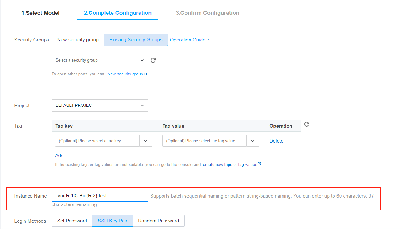 Saat Anda perlu membeli n instans dan membuat nama instans dalam bentuk tertentu, seperti “CVM+Sequence number” (misalnya, CVM 1, CVM 2, dan CVM 3), Anda dapat menggunakan fitur Secara Otomatis Menaikkan Nomor Berakhiran. Saat Anda perlu membuat instans n (n) dan memberi nama instans tertentu dengan nomor menaik mulai dari x (x), Anda dapat menggunakan fitur Menentukan Satu String Pola. Saat Anda perlu membuat n instans dengan beberapa awalan dalam namanya, yang masing-masing berisi nomor seri tertentu, Anda dapat menggunakan fitur Menentukan Beberapa String Pola. Langkah-Langkah