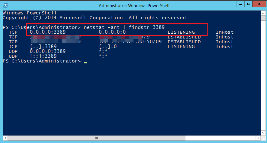 1. Login ke instans CVM. Klik untuk membuka jendela Windows PowerShell (Windows PowerShell). 2. Di jendela Windows PowerShell (Windows PowerShell), jalankan perintah berikut untuk memeriksa status desktop jarak jauh (secara default, desktop jarak jauh menggunakan port 3389).