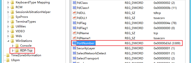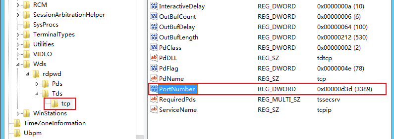 3. Temukan PortNumber di tcp (tcp) dan catat nomor port (3389 secara default), seperti yang ditunjukkan pada gambar berikut: