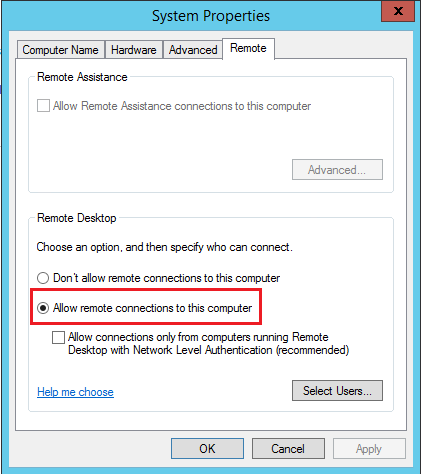 3. Di jendela System Properties (Properti Sistem), pilih tab Remote (Jarak Jauh). Periksa apakah Allow remote connections to this computer (Izinkan koneksi jarak jauh ke komputer ini) di bawah Remote Desktop (Desktop Jarak Jauh) dipilih, seperti yang ditunjukkan pada gambar berikut: