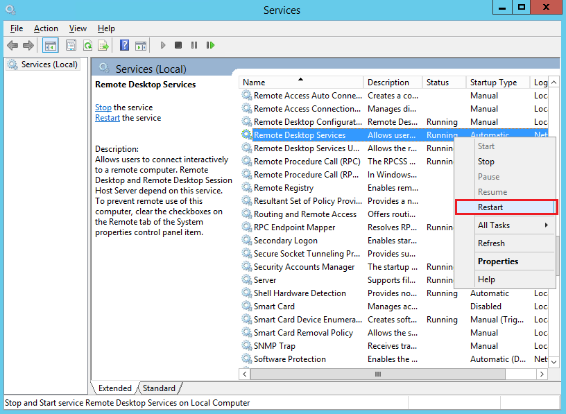 1. Login ke instans CVM. Klik dan pilih . Masukkan services.msc (services.msc) dan tekan Enter (Enter) untuk membuka jendela Services (Layanan). 2. Di jendela Services (Layanan), klik kanan Remote Desktop Services (Layanan Desktop Jarak Jauh) dan pilih Restart (Mulai Ulang) untuk memulai ulang layanan desktop jarak jauh, seperti yang ditunjukkan pada gambar berikut: