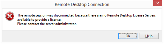 Ketika Anda mencoba untuk menghubungkan ke instans Windows menggunakan Windows Remote Desktop, prompt yang menyatakan "Remote session has been disconnected as no remote desktop authorization server is available for licensing. For assistance, please contact your system administrator" (Sesi jarak jauh telah diputus sambungannya karena tidak ada server otorisasi desktop jarak jauh yang tersedia untuk lisensi. Untuk bantuan, hubungi administrator sistem Anda) muncul, seperti yang ditunjukkan pada gambar berikut: